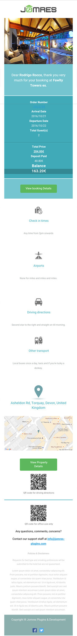 This plugin overrides all Jomres core emails (email_admin_cancelbooking, email_admin_newbooking, email_guest_cancelbooking, email_guest_confirmationletter, email_guest_newbooking, email_hotel_cancelbooking, email_hotel_newbooking ) giving Jomres professional look and responsive emails.